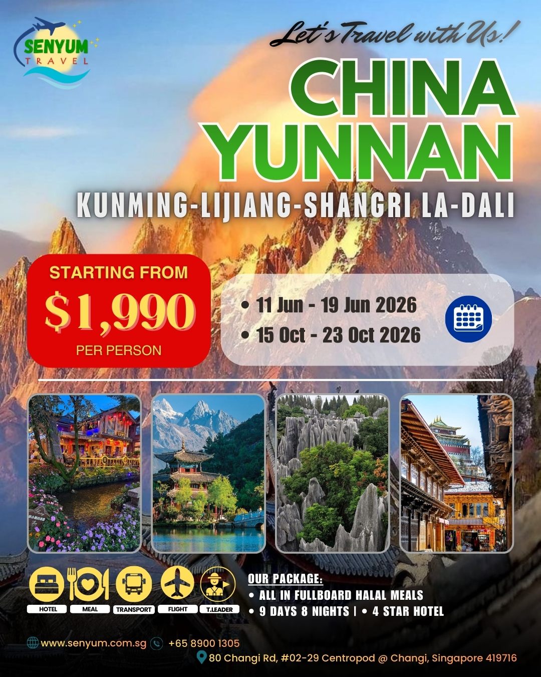 Highlights  :   Kunming – Dali – Lijiang – Shangri La Tour,  Full Board Halal Meals