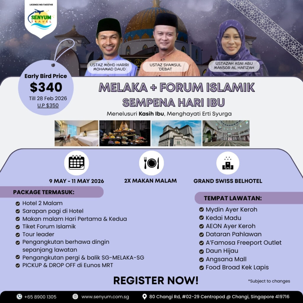 Celebrate the love of mothers with Senyum Travel’s 3 Days 2 Nights Islamic Tour from 9–11 May 2026, specially curated for a meaningful Mother’s Day experience. This exclusive journey takes you from Singapore to Melaka and Johor Bahru, combining a reflective Islamic forum with leisure visits to popular attractions. Guided by renowned asatizah — Ustaz Mohd Hariri Mohamad Daud, Ustaz Syamsul Debat, and Ustazah Asni Abu Mansor Al Hafizah — participants will explore the virtues, sacrifices, and esteemed status of mothers in Islam. Enjoy comfortable accommodation at Grand Swiss-Belhotel Melaka, daily breakfast, two special dinners including a Mother’s Day celebration, visits to Mydin, AEON Ayer Keroh, Dataran Pahlawan, A’Famosa Freeport Outlet, and hassle-free transport from Singapore. Early Bird: SGD340. Limited seats—book now for an unforgettable experience!