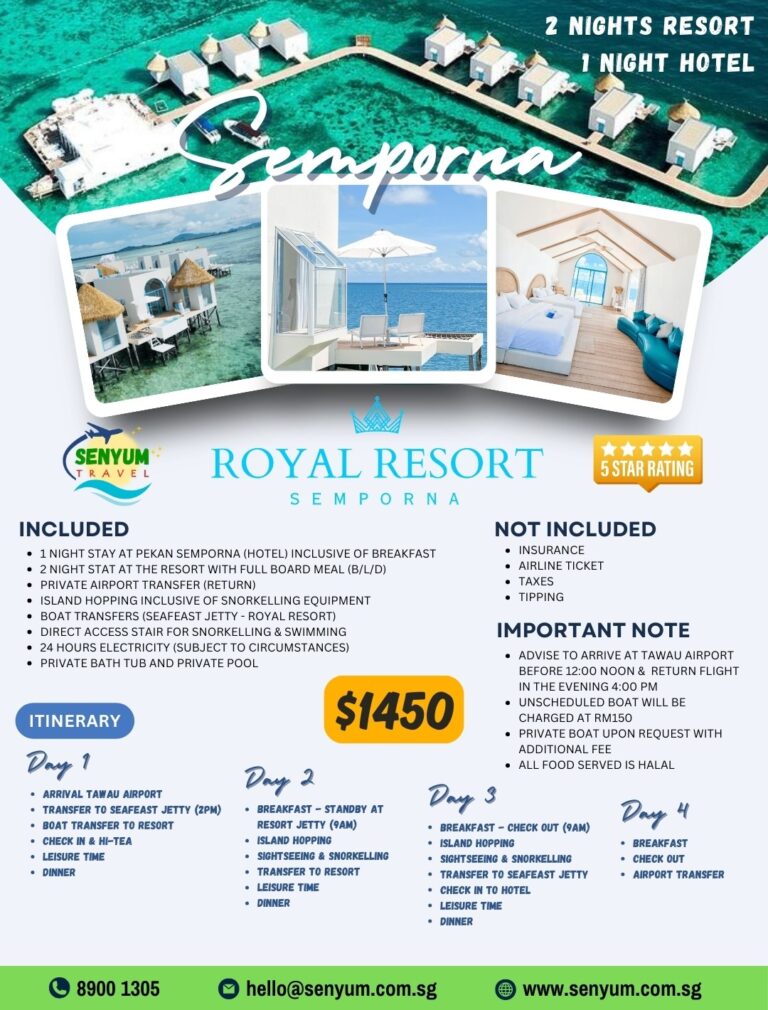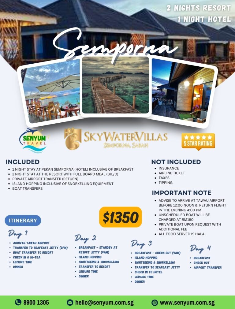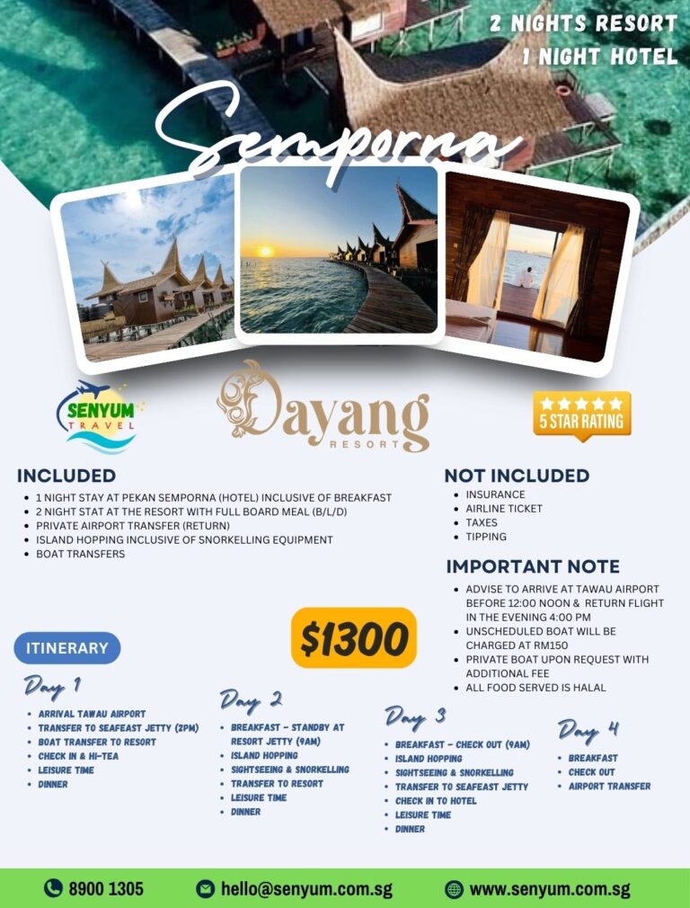 Escape to paradise with our exclusive Semporna packages – where turquoise waters, luxury resorts, and island adventures await. Perfect for a short getaway or a dream holiday, our packages include 2 nights resort stay + 1 night hotel stay, full board meals, island-hopping tours, and snorkeling in some of the most stunning waters in Malaysia.